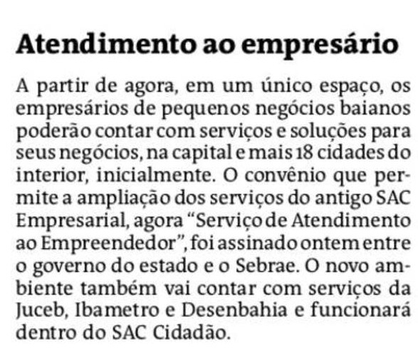 A partir de agora, em um único espaço, os empresários de pequenos negócios baianos poderão contar com uma cartela de serviços e soluções práticas para seus negócios, na capital e mais 18 cidades do interior, inicialmente. O convênio que permite a ampliação dos serviços do antigo SAC Empresarial, agora “Serviço de Atendimento ao Empreendedor”, foi assinado entre o Governo do Estado e o Sebrae, nesta sexta-feira (28). O novo ambiente multifunções também vai contar com serviços da Juceb, Ibametro e Desenbahia e funcionará dentro do SAC Cidadão.