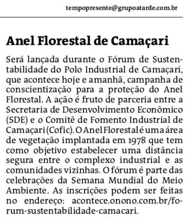 Uma campanha de conscientização para a proteção do Anel Florestal será lançada durante o Fórum de Sustentabilidade do Polo Industrial de Camaçari, que será realizado nos dias 1 e 2 de junho. A ação é fruto de uma parceria entre a Secretaria de Desenvolvimento Econômico (SDE) e o Comitê de Fomento Industrial de Camaçari (Cofic).