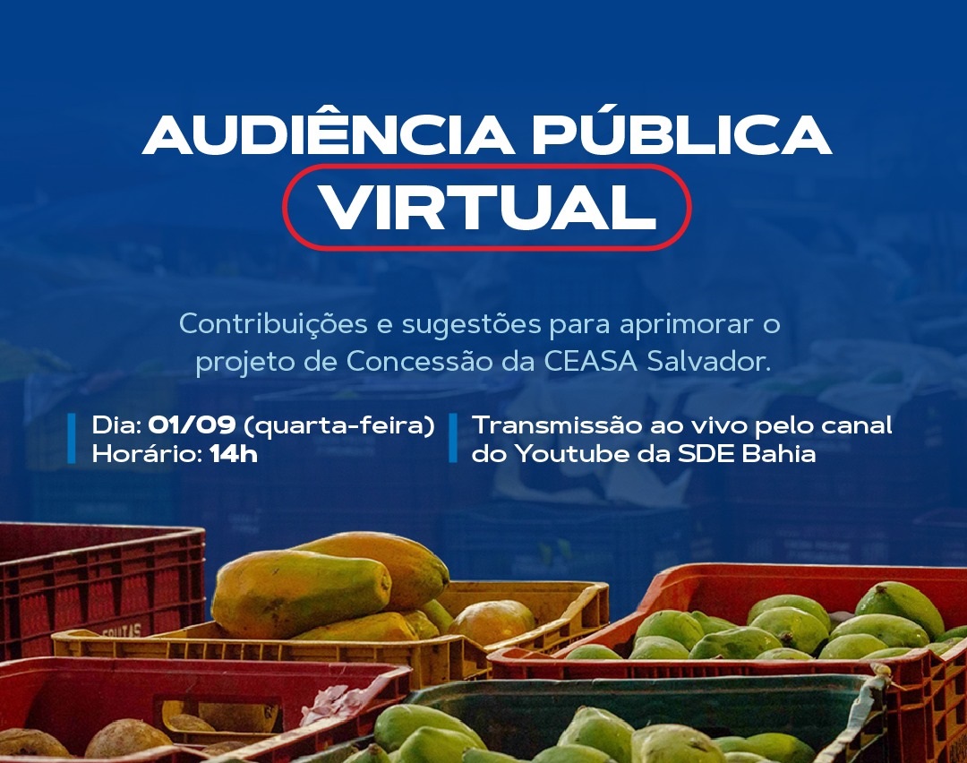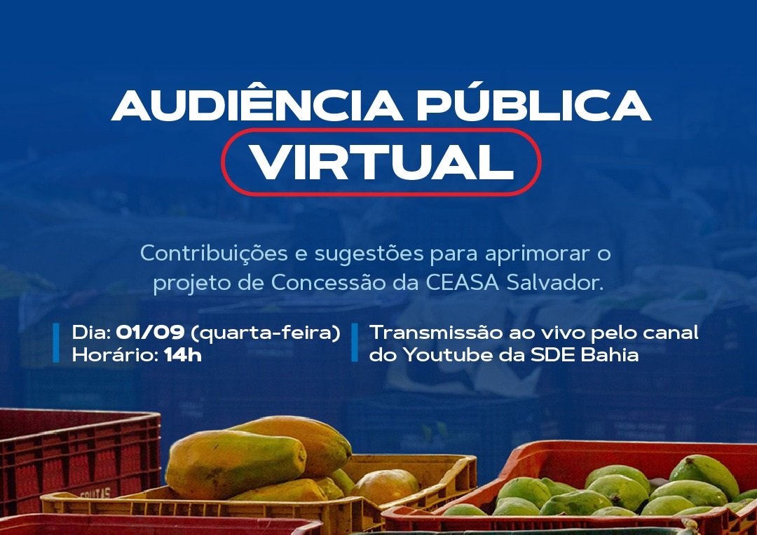 Na próxima quarta-feira (01/09), a Secretaria de Desenvolvimento Econômico – SDE, realiza audiência pública, em formato exclusivamente virtual, para apresentação do Projeto de Concessão do Centro de Abastecimento de Salvador (CEASA). A transmissão ao vivo será disponibilizada a partir das 14h, no canal do YouTube da SDE (https://www.youtube.com/c/SDEBahia). O evento será realizado de forma virtual, obedecendo os protocolos de prevenção para minimizar os riscos de transmissão da Covid-19.
