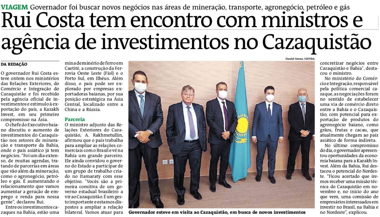 Em seu primeiro compromisso na Ásia, na missão internacional que começou na última segunda-feira (18), o governador Rui Costa chegou à cidade de Nursultan, capital do Cazaquistão, acompanhado dos secretários, da SDE Nelson Leal e da Seinfra, Marcus Cavalcanti, onde apresentou oportunidades de negócios na Bahia a autoridades do país. Nesta quarta-feira (20), Rui esteve nos ministérios das Relações Exteriores, do Comércio e Integração e foi recebido pela agência oficial de investimentos e estímulo à exportação, a Kazakh Invest.