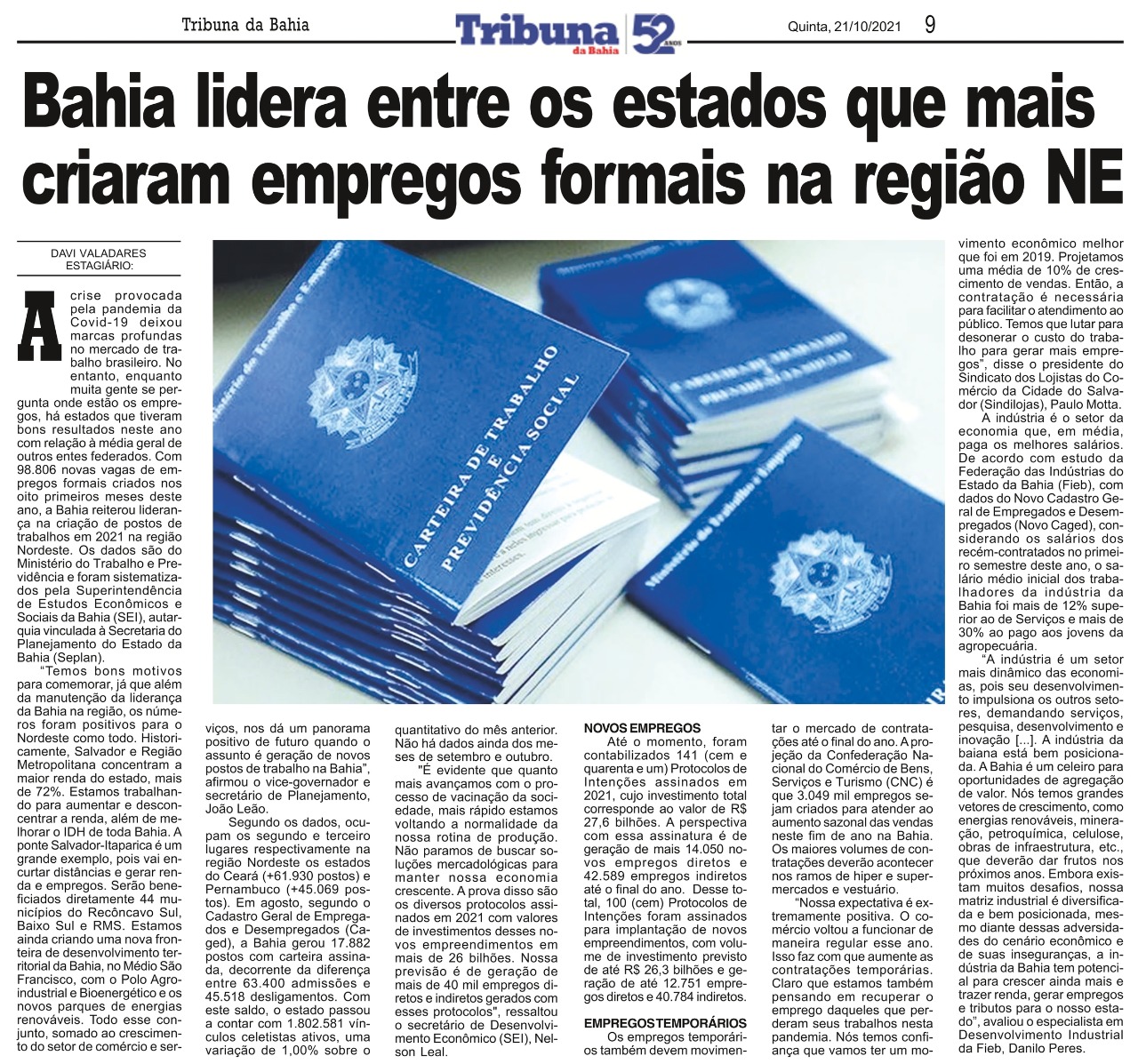O segmento da indústria na Bahia gerou, entre janeiro a agosto desse ano, 31.323 mil postos de trabalho. Somente em agosto, o saldo positivo de empregos foi de 4.993 empregos, puxado pelos setores de Couro e Calçados; Alimentícios e Minerais Não-Metálicos. As informações são do Informe de Indústria de utubro da Secretaria de Desenvolvimento Econômico (SDE).