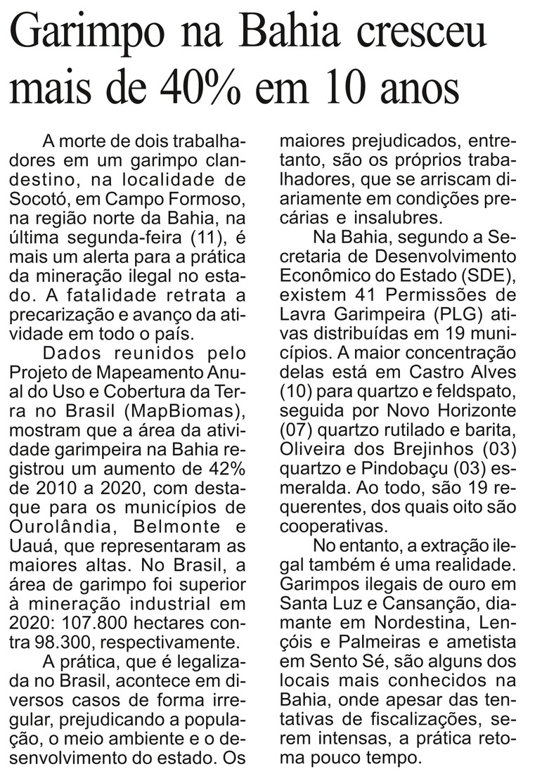 Garimpo na Bahia cresceu mais de 40% em 10 anos
