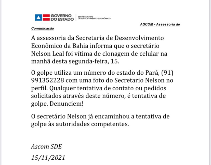 A assessoria da Secretaria de Desenvolvimento Econômico da Bahia informa que o secretário Nelson Leal foi vítima de clonagem de celular na manhã desta segunda-feira, 15.