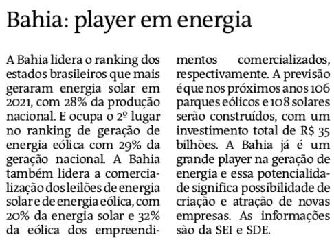 A Bahia lidera o ranking dos estados brasileiros que mais geraram energia solar em 2021, com 28% da produção nacional. E ocupa o 2º lugar no ranking de geração de energia eólica com 29% da geração nacional.