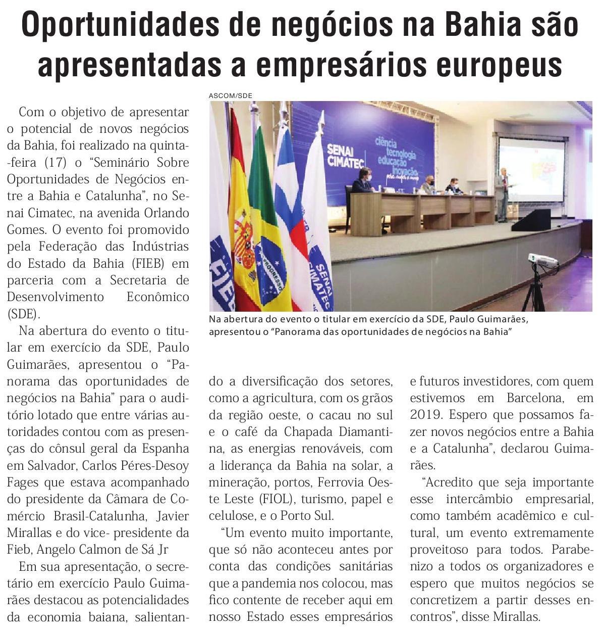 Com o objetivo de apresentar o potencial de novos negócios da Bahia, foi realizado nesta quinta-feira (17) o “Seminário Sobre Oportunidades de Negócios entre a Bahia e Catalunha”, no Senai Cimatec, na avenida Orlando Gomes. O evento foi promovido pela Federação das Indústrias do Estado da Bahia (FIEB) em parceria com a Secretaria de Desenvolvimento Econômico (SDE).