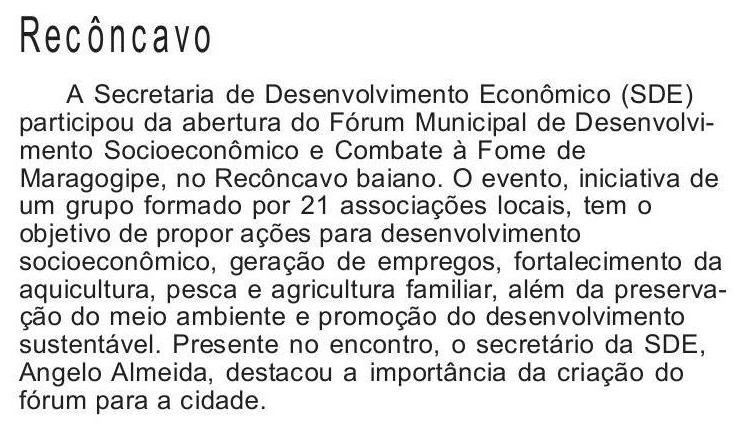 A Secretaria de Desenvolvimento Econômico (SDE) participou, nesse domingo (09), da abertura do Fórum Municipal de Desenvolvimento Socioeconômico e Combate à Fome de Maragogipe, no Recôncavo baiano. O evento, iniciativa de um grupo formado por 21 associações locais, tem o objetivo de propor ações para desenvolvimento socioeconômico, geração de empregos, fortalecimento da aquicultura, pesca e agricultura familiar, além da preservação do meio ambiente e promoção do desenvolvimento sustentável.