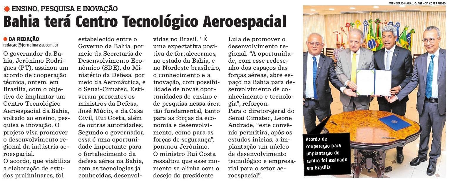 Foi assinado, nesta segunda-feira (31), em Brasília, um acordo de cooperação técnica que visa a implantação do Centro Tecnológico Aeroespacial da Bahia, voltado ao ensino, pesquisa e inovação, a fim de promover o desenvolvimento regional da indústria aeroespacial no estado. O acordo, que viabiliza a elaboração de estudos preliminares, foi estabelecido entre o Governo da Bahia, por meio da Secretaria de Desenvolvimento Econômico (SDE), o Ministério da Defesa, por meio da Aeronática, e o Senai-Cimatec. Estiveram presentes na solenidade o governador Jerônimo Rodrigues, os ministros da Defesa, José Múcio, e da Casa Civil, Rui Costa, além de outras autoridades.