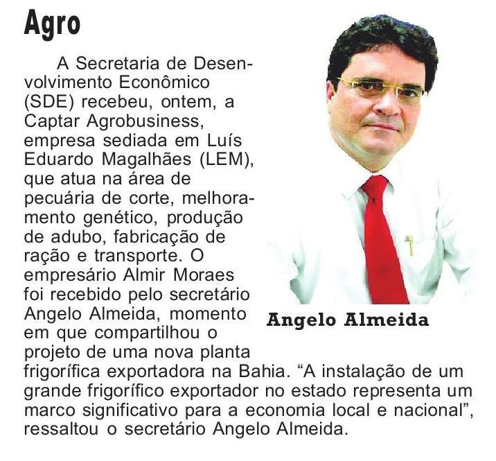 A Secretaria de Desenvolvimento Econômico (SDE) recebeu, nesta sexta-feira (17), a Captar Agrobusiness, empresa sediada em Luís Eduardo Magalhães (LEM), que atua na área de pecuária de corte, melhoramento genético, produção de adubo, fabricação de ração e transporte. O empresário Almir Moraes foi recebido pelo secretário Angelo Almeida, momento em que compartilhou o projeto de uma nova planta frigorífica exportadora na Bahia.