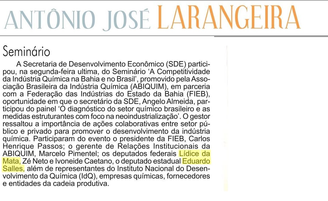 A Secretaria de Desenvolvimento Econômico (SDE) participou, nessa segunda-feira (20), do Seminário ‘A Competitividade da Indústria Química na Bahia e no Brasil’, promovido pela Associação Brasileira da Indústria Química (ABIQUIM), em parceria com a Federação das Indústrias do Estado da Bahia (FIEB). Durante o evento, o secretário da SDE, Angelo Almeida, participou do painel ‘O diagnóstico do setor químico brasileiro e as medidas estruturantes com foco na neoindustrialização’.
