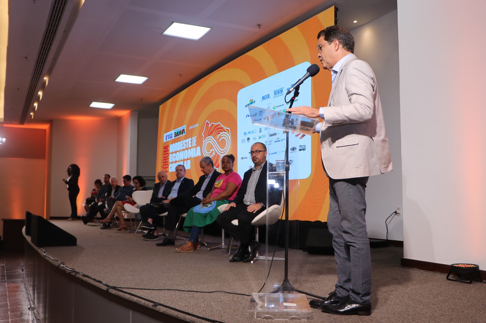 Além das autoridades estaduais, participaram da abertura do I Fórum Nordeste de Economia Circular o presidente da Federação das Indústrias do Estado da Bahia, Carlos Henrique Passos, Sissi Alves da Silva, coordenadora-geral de Bioeconomia e Economia Circular do Ministério do Desenvolvimento, Indústria, Comércio e Serviço, Danilo Cabral, Superintendente da Superintendência do Desenvolvimento Nordeste – SUDENE, Jorge Kroury, Diretor Presidente do Sebrae, Leone Andrade, Diretor Geral do Senai Cimatec, Leonel Leal, Coordenador Local de Projetos do Programa das Nações Unidas para o Desenvolvimento (PNUD), Wagner Alencar, Diretor de Crédito Financeiro do Banco do Nordeste (BNB), Glauber Piva, Secretário Executivo do Consórcio Nordeste, e Jeane Santos, representante do Movimento Nacional dos Catadores de Material Reciclado.
