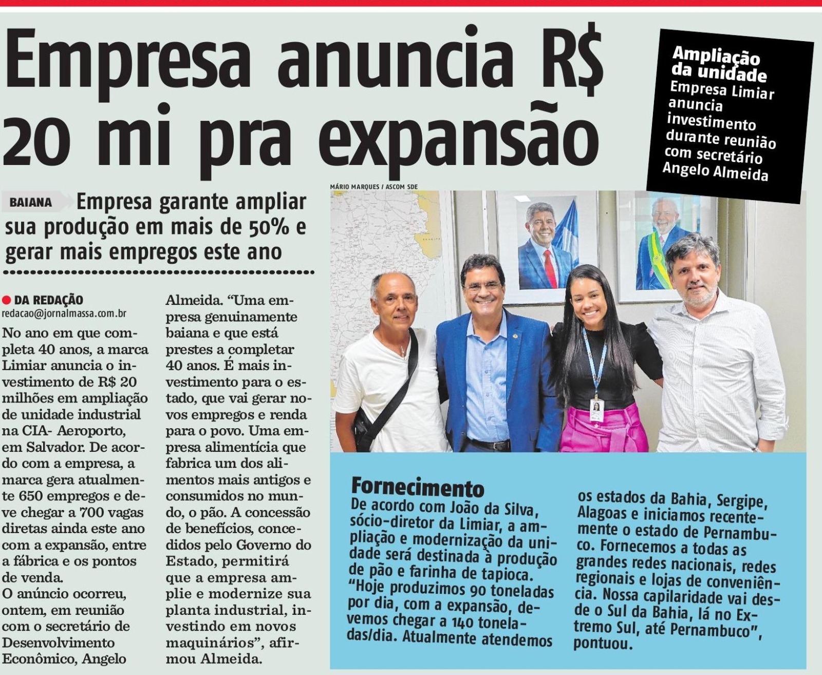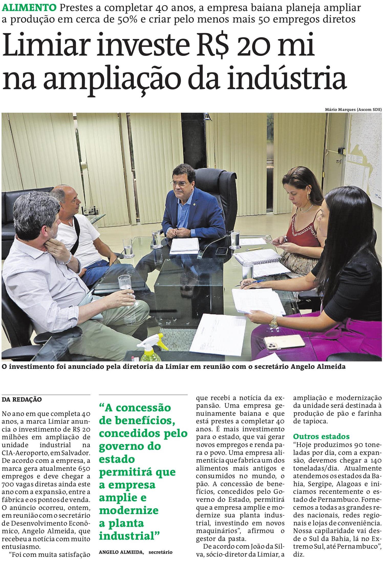 No ano em que completa 40 anos, a marca Limiar anuncia o investimento de R$ 20 milhões em ampliação de unidade industrial na CIA-Aeroporto, em Salvador. De acordo com a empresa, a marca gera atualmente 650 empregos e deve chegar a 700 vagas diretas ainda este ano com a expansão, entre a fábrica e os pontos de venda. O anúncio ocorreu em reunião com o secretário de Desenvolvimento Econômico, Angelo Almeida, nesta quinta-feira (25), que recebeu a notícia com muito entusiasmo.
