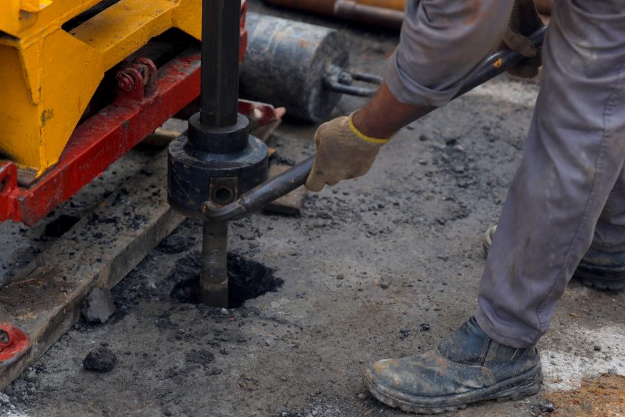 A perfuração para coleta de amostras do solo foi realizada em uma área próxima ao terminal do ferry boat. Com uso de uma perfuratriz, são obtidos fragmentos do solo no local, onde posteriormente será instalado um pilar da ponte