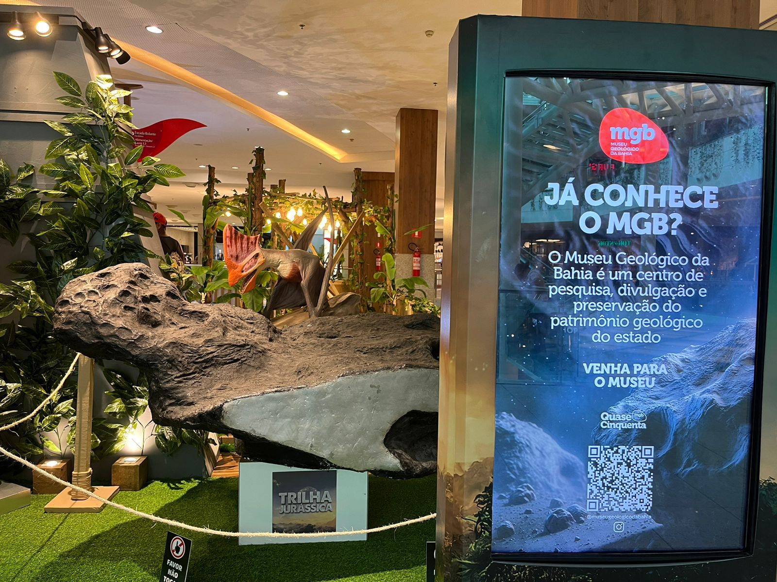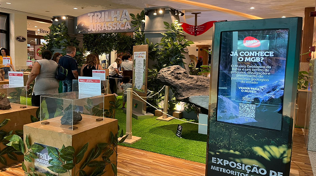 Quem passeou pelo Salvador Shopping, do dia 04 a 31 de março, pôde conhecer um pedaço do Museu Geológico da Bahia (MGB), órgão administrado pela Secretaria de Desenvolvimento Econômico da Bahia (SDE), que aterrissou no local. A exposição ‘Quase Cinquenta: preservando riquezas, de meteoritos a fósseis’ registrou mais de 53 mil visitantes durante a realização, fazendo parte da maior exposição de dinossauros da América Latina, “Mundo Jurássico”. O evento integrou a programação do aniversário do Museu, que completou 49 anos no dia da abertura da exposição. Durante a exibição, estudantes de Geologia e funcionários do MGB guiaram a visita monitorada, das 13h às 19h, tirando dúvidas do público e trazendo curiosidades sobre os minerais presentes na exposição.