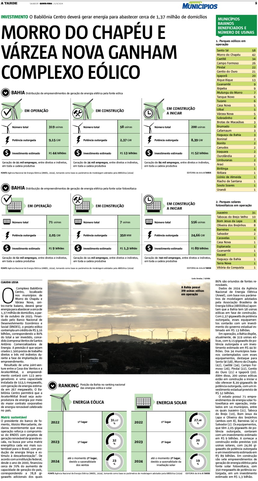 Morro do Chapéu e Várzea Nova ganham complexo eólico