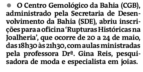 O Centro Gemológico da Bahia (CGB), órgão administrado pela Secretaria de Desenvolvimento da Bahia (SDE), está com as inscrições abertas para a oficina inédita ‘Rupturas Histórias na Joalheria’, que ocorrerá entre os dias 20 e 24 de maio, das 18h30 às 21h30. As aulas serão ministradas pela profª. Drª. Gina Reis, pesquisadora de moda e especialista em joias, membro do grupo de Pesquisa Corpo e Cultura.