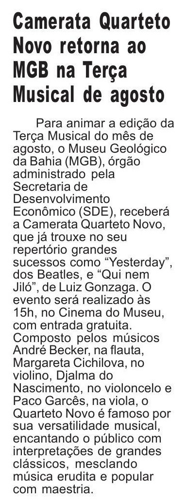 Para animar a edição da Terça Musical do mês de agosto, o Museu Geológico da Bahia (MGB), órgão administrado pela Secretaria de Desenvolvimento Econômico (SDE), receberá a Camerata Quarteto Novo, que já trouxe no seu repertório grandes sucessos como “Yesterday”, dos Beatles, e “Qui nem Jiló”, de Luiz Gonzaga. O evento será realizado às 15h, no Cinema do Museu, com entrada gratuita.