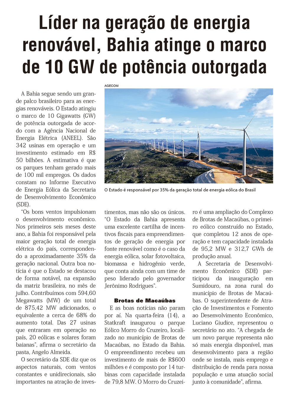Líder na geração de energia renovável, Bahia atinge o marco de 10 GW de potência outorgada