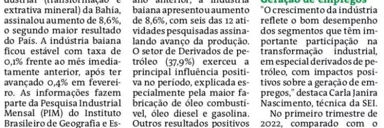 Com aumento de 8,6% em março, produção industrial baiana é a segunda que mais cresceu no país