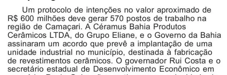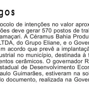 Empresa de cerâmica prevê investir R$ 600 milhões em Camaçari e gerar 570 postos de trabalho