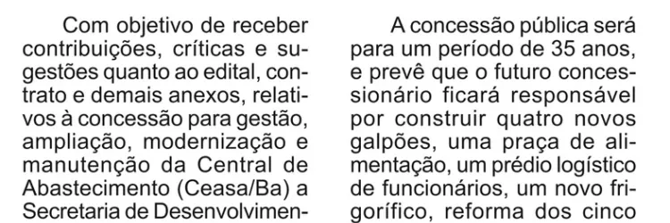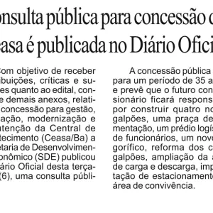 Consulta pública para concessão da Ceasa é publicada no Diário Oficial
