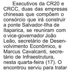 Ponte Salvador-Itaparica: Executivos chineses se reúnem com Governo do Estado