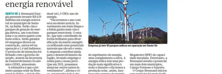 Brennad Energia anuncia investimento de R$ 629 milhões em energia renovável em Sento Sé, na Bahia