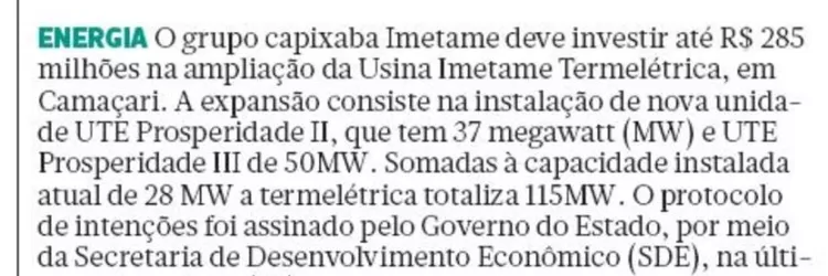 Imetame pretende ampliar sua unidade para produzir energia elétrica em Camaçari