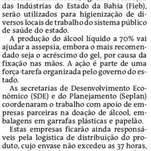 Doação de usinas baianas vai gerar 260 mil litros de álcool 70% para sistema público de saúde