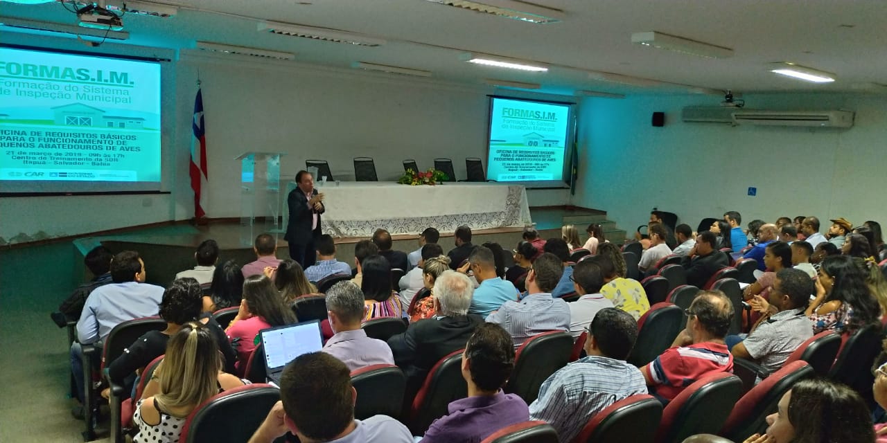 Mais de 160 representantes de municípios baianos participaram, nesta quinta-feira (21), em Salvador, de uma oficina de requisitos básicos para o funcionamento de pequenos abatedouros. A iniciativa faz parte da Formação do Sistema de Inspeção Municipal (FormaSim), uma estratégia da Companhia de Desenvolvimento e Ação Regional (CAR), empresa pública vinculada à Secretaria de Desenvolvimento Rural (SDR), para fomentar a implantação do Serviço de Inspeção nos municípios do estado da Bahia por intermédio de consórcios públicos.