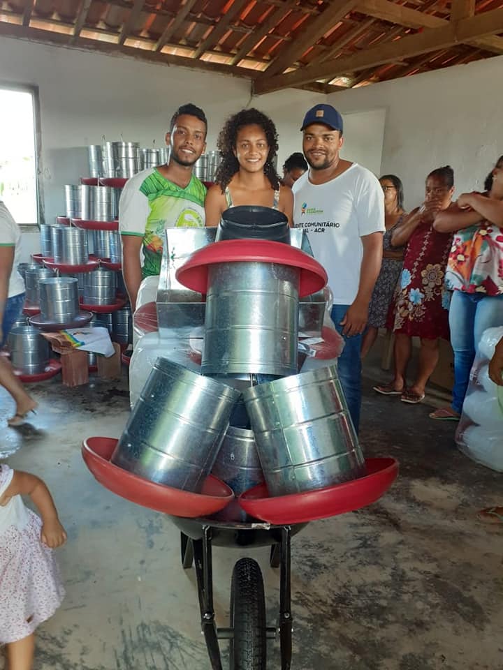 No município de Teolândia, Território de Identidade do Baixo Sul, a Associação de Agricultores da Comunidade de Bom Jesus do Putumuju comemorou mais uma etapa concluída do projeto Bahia Produtiva. Foram entregues para 20 famílias beneficiárias comedouro e bebedouro, carro de mão, pulverizador e chocadeira, campânula, baldes, e triturador para melhorar a produção de galinhas caipiras.