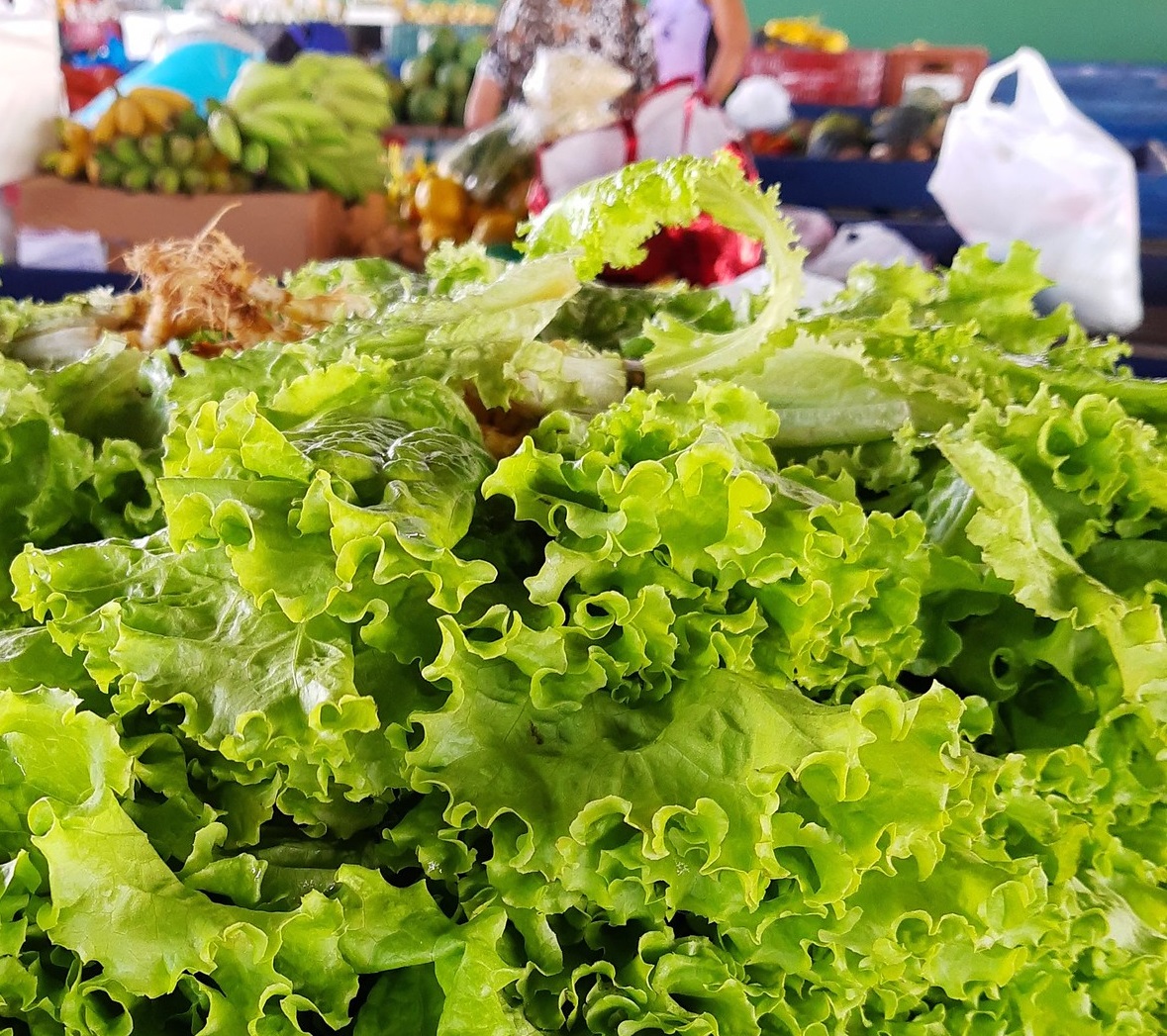 Na banca do agricultor familiar Antônio Maia, da comunidade de Lagoa Nova de São Gabriel, que mantém distância da barraca vizinha, hortaliças, frutas e verduras fresquinhas, colhidas na sua propriedade, estão à venda. De máscara, ele atende a clientela, um de cada vez: “Tô vendendo de tudo um pouco, apesar dessa pandemia, mas seguimos firmes aqui”.