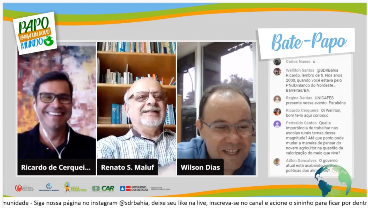 O professor Renato Maluf falou sobre a construção brasileira das noções de alimentação adequada saudável e da soberania alimentar e nutricional, sobre o contexto atual e o papel do Bahia Produtiva: “É um enorme mérito ter um projeto com foco na produção agroalimentar, que amplia a preocupação com a alimentação das famílias agrícolas, recorrendo ao enfoque da segurança alimentar e nutricional. Estamos vivendo um dos contextos mais graves da história do Brasil e o Bahia Produtiva está no caminho certo, não só pela junção da dimensão alimentar e nutricional ser necessária, importante e correta, conceitualmente falando, mas por ser indispensável nesse contexto. Tenho satisfação em ver que a Bahia está avançando”.