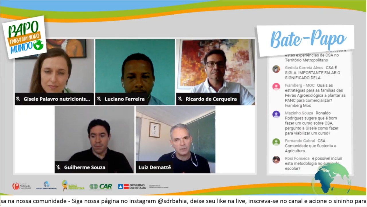 O Papo para um Novo Mundo, voltado para Segurança Alimentar e Nutricional: Produção, Consumo e Inclusão Produtiva, que iniciou nesta segunda-feira (03), debateu sobre Alimentação Saudável e Segurança Alimentar: o desafio para a sociedade e governos (Bahia.link/painel1); Panorama sobre a Segurança Alimentar e Nutricional, na Bahia, no Brasil e no Mundo (Bahia.link/painel2); Segurança Alimentar e Nutricional na prática - Políticas Públicas de apoio a Segurança Alimentar e Nutricional: produção, consumo e geração de renda como caminho para autonomia (Bahia.link/painel3); Plantas Alimentícias Não Convencionais (PANC) e sua relação na garantia da Segurança Alimentar e Nutricional (Bahia.link/painel4); e Produção versus Consumo: como assegurar alimentação para todos? (Bahia.link/painel5). Para conferir ou rever todo esse conteúdo acesse: https://urless.in/NgAV9.