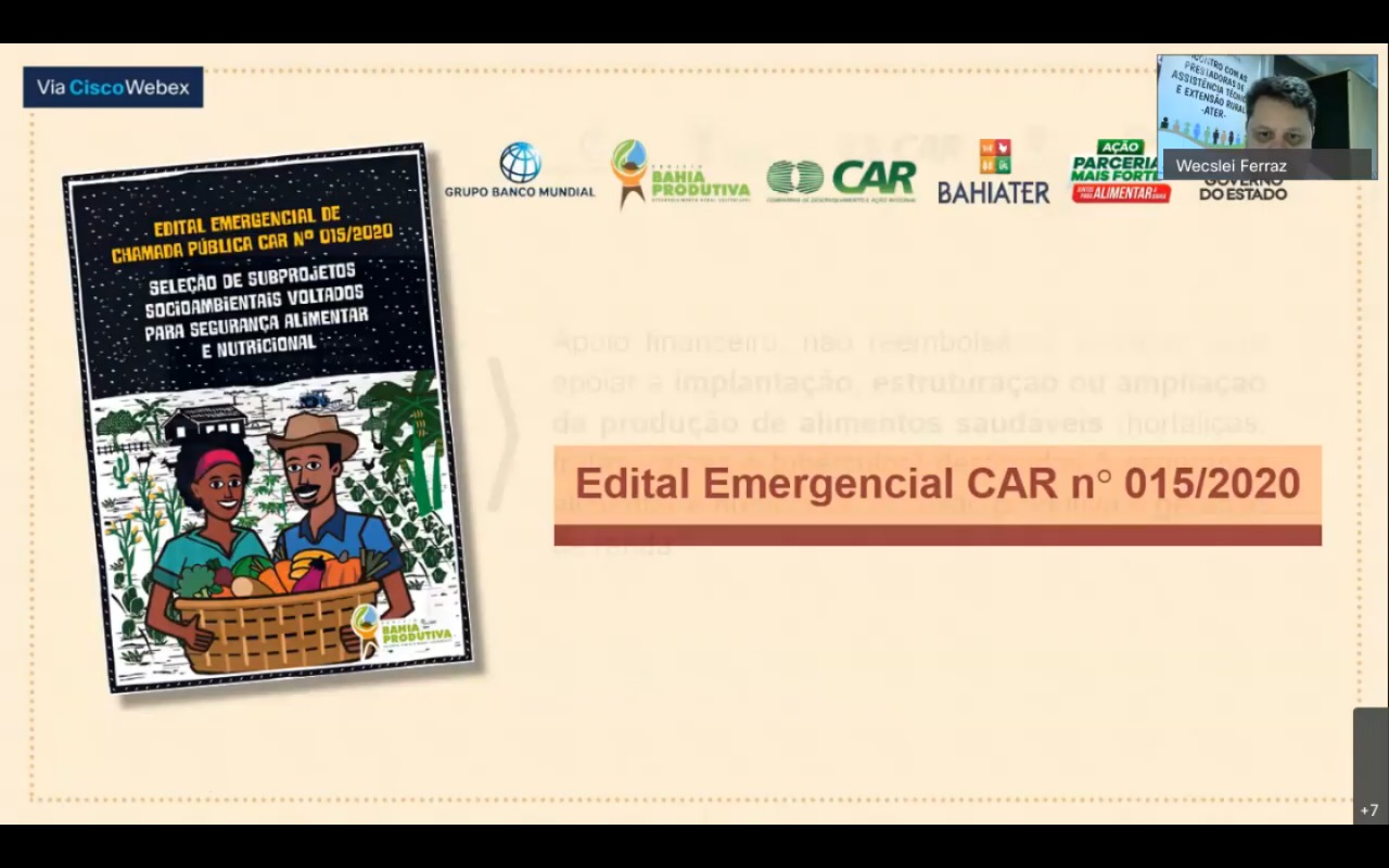 Para garantir a execução do edital emergencial de Segurança Alimentar e Nutricional, edital 15, do projeto do Governo do Estado, Bahia Produtiva, foi realizada, nesta quarta-feira (23), mais uma reunião virtual para prestar esclarecimentos e tirar dúvidas sobre o edital. Desta vez, a reunião, que foi transmitida pelo canal SDRBahia, no Youtube, foi direcionada para representantes das 324 associações e cooperativas selecionadas.