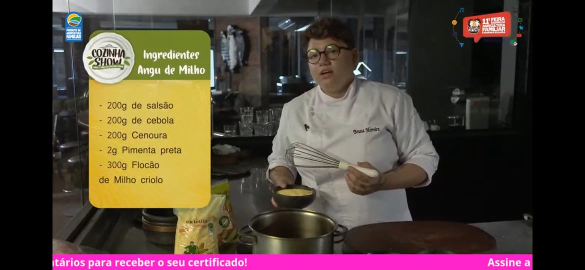 Com caprino da Cooperativa Agroindustrial de Pintadas (Cooap) e flocão Puro Milho não transgênico da Cooperativa Agropecuária Mista Regional de Irecê (Copirecê), a chef Bruna Moreira apresentou a receita “Bouef Bourguignon de Bode com Angu de Milho não transgênico” na Cozinha Show – Sabores e Saberes da Agricultura Familiar desta quinta-feira (10).