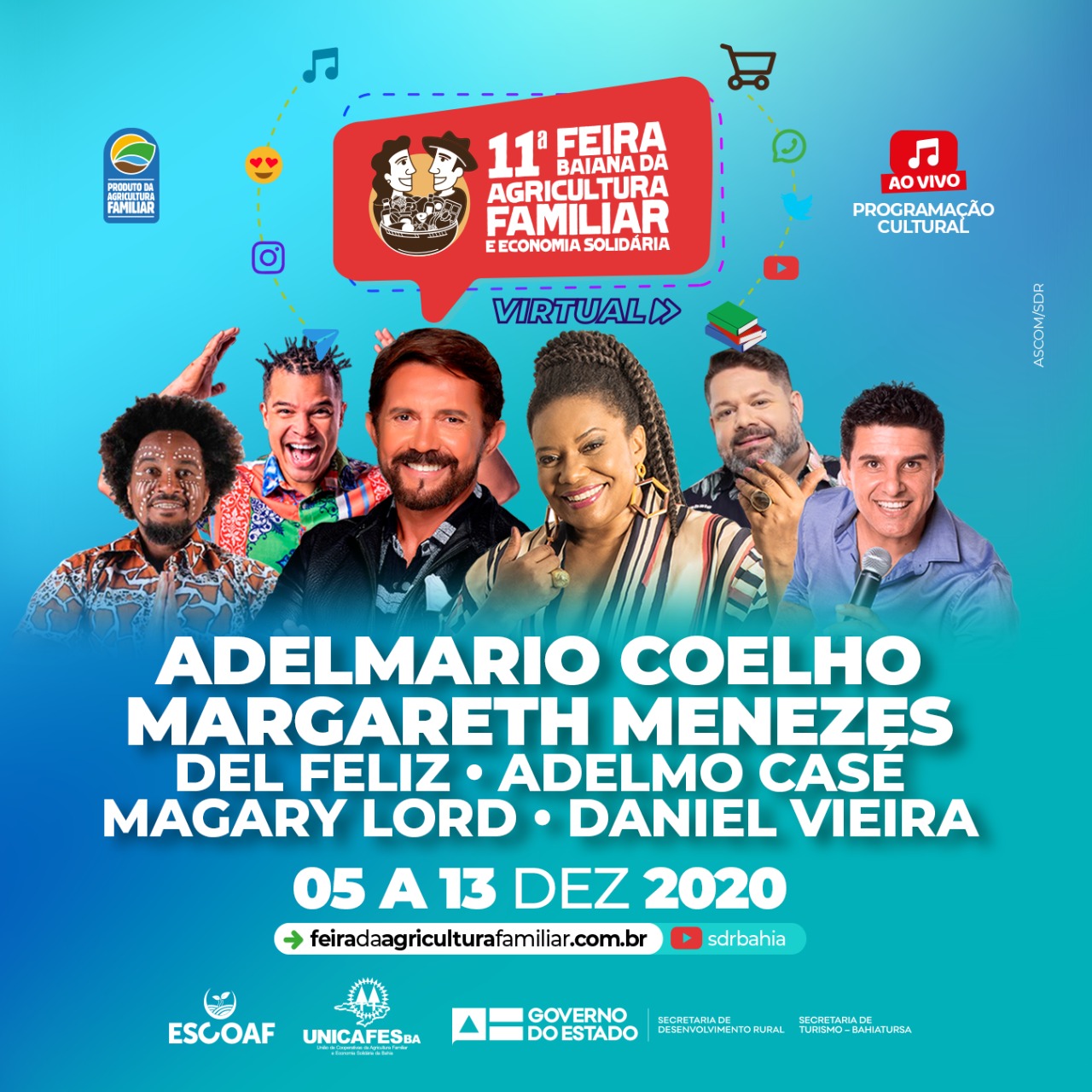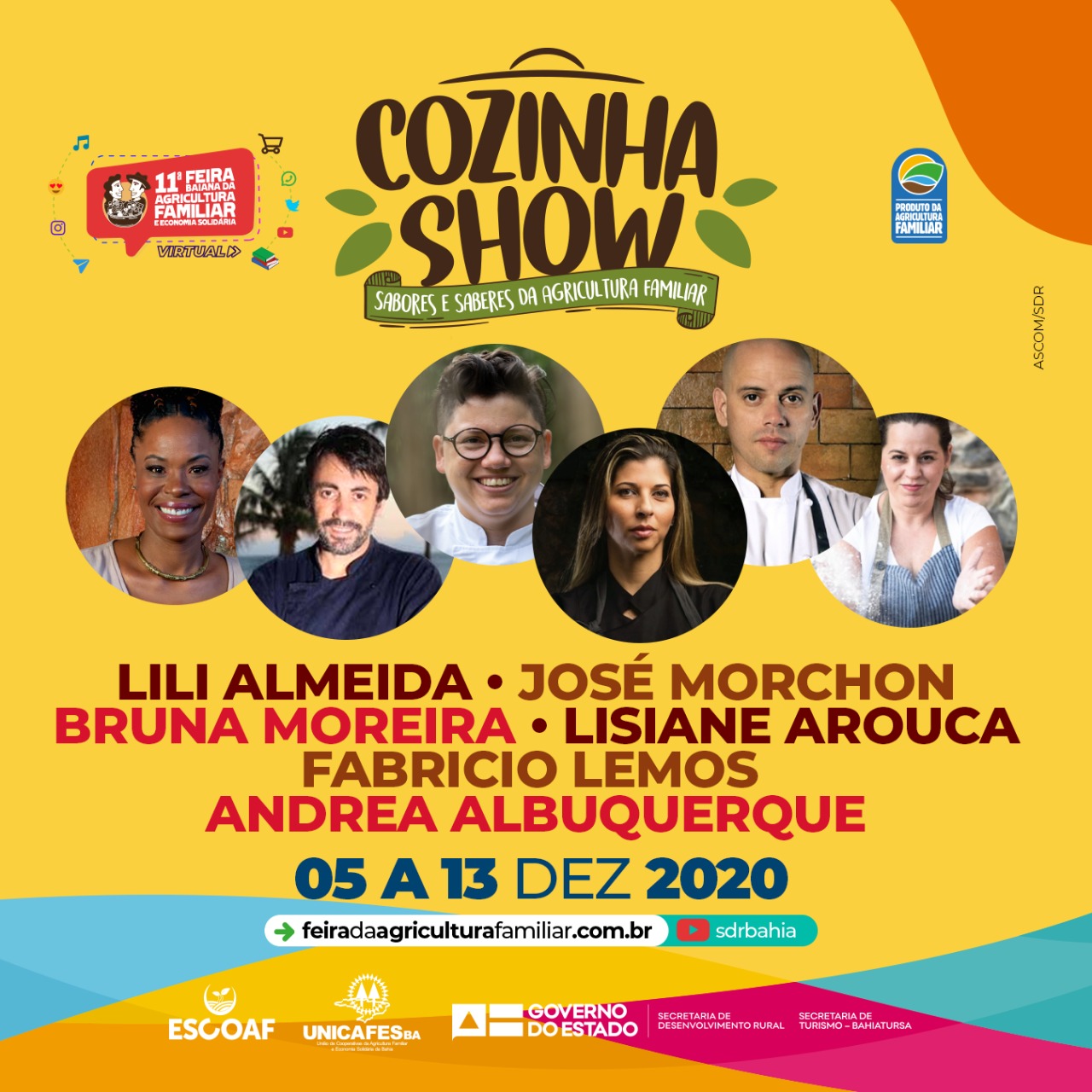 Neste sábado (12), a Cozinha Show vai ter aula prática do chef Fabrício Lemos. Depois, às 19h, é o momento de curtir um som, com a live de Adelmo Casé. No domingo (13), a Cozinha Show traz a aula da chef Lili Almeida. Para fechar a programação da Feira, Adelmário Coelho é a atração cultural.