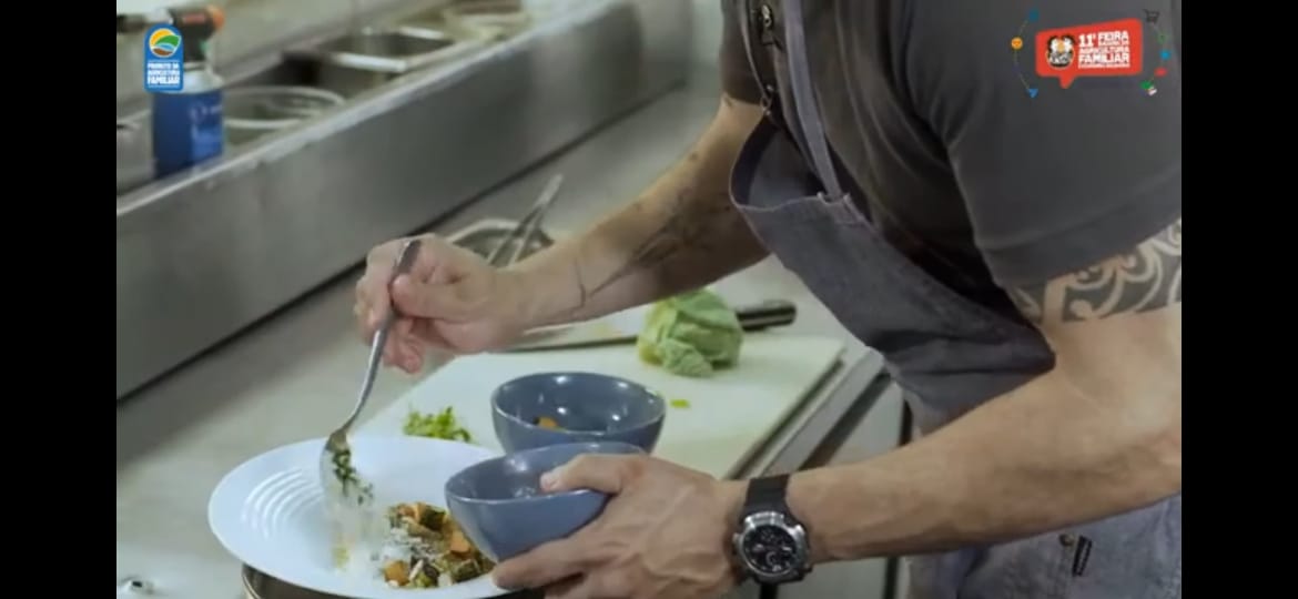 A Cozinha Show - Sabores e Saberes da Agricultura Familiar apresentou, neste sábado (12), a receita de “Arroz de galinha caipira e fumeiro com farofa de beiju de copioba” do chef Fabricio Lemos. O prato leva galinha caipira da Feira Agroecológica do Picolino, fumeiro da Associação dos Produtores de Fumeiro de Maragogipe e beiju e farinha de copioba da Agroindústria da Agricultura Familiar de Brinco (Abrinco).