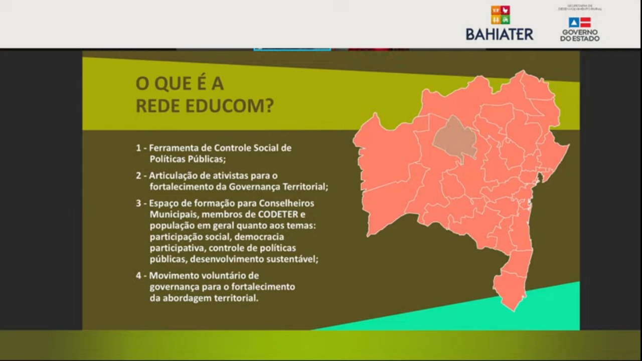 Está em curso, ainda, a campanha do Conselho Estadual de Desenvolvimento Rural Sustentável (CEDRS), coordenada pelo DFOC, da CAR/SDR, para renovar a regularização e homologação dos Conselhos Municipais de Desenvolvimento Sustentável (CMDS) e a Rede de Controle Social e Desenvolvimento Territorial Sustentável (Rede Educom), que envolve os CMDS e os Conselhos de Desenvolvimento Territorial (Codeter), nos 27 Territórios de Identidade. O DFOC fará formação para milhares de conselheiros e membros do Codeter, para fortalecer a abordagem territorial e a governança, após a campanha.