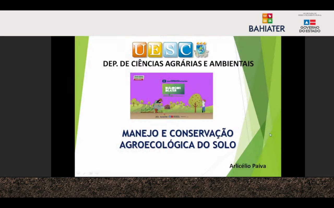 No mês em que se comemora o Dia Nacional de Conservação do Solo (15 de abril), o encontro do Diálogos de Ater traz, nesta quinta-feira (22), o tema Manejo e Conservação Agroecológica do Solo. A apresentação do tema ficou por conta do doutor em Solos e Nutrição de Plantas e professor Universidade Estadual de Santa Cruz (UESC) Arlicélio de Queiroz Paiva.