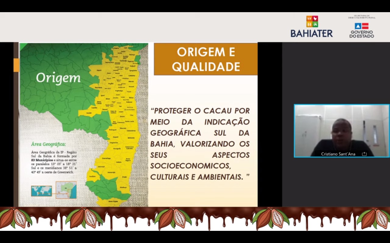 O encontro do Diálogos de Ater, desta quinta-feira (20), trouxe para o debate o tema: Indicação Geográfica - IG do Cacau do Sul da Bahia. A apresentação ficou por conta do engenheiro agrônomo e mestre em Desenvolvimento Regional e Meio Ambiente, Cristiano Sant’Ana. O evento, transmitido ao vivo pelo Canal SDRBahia, no Youtube, é uma iniciativa da Secretaria de Desenvolvimento Rural (SDR), por meio da Superintendência Baiana de Assistência Técnica e Extensão Rural (Bahiater) e da Coordenação de Pesquisa, Inovação e Extensão Tecnológica (Cepex).