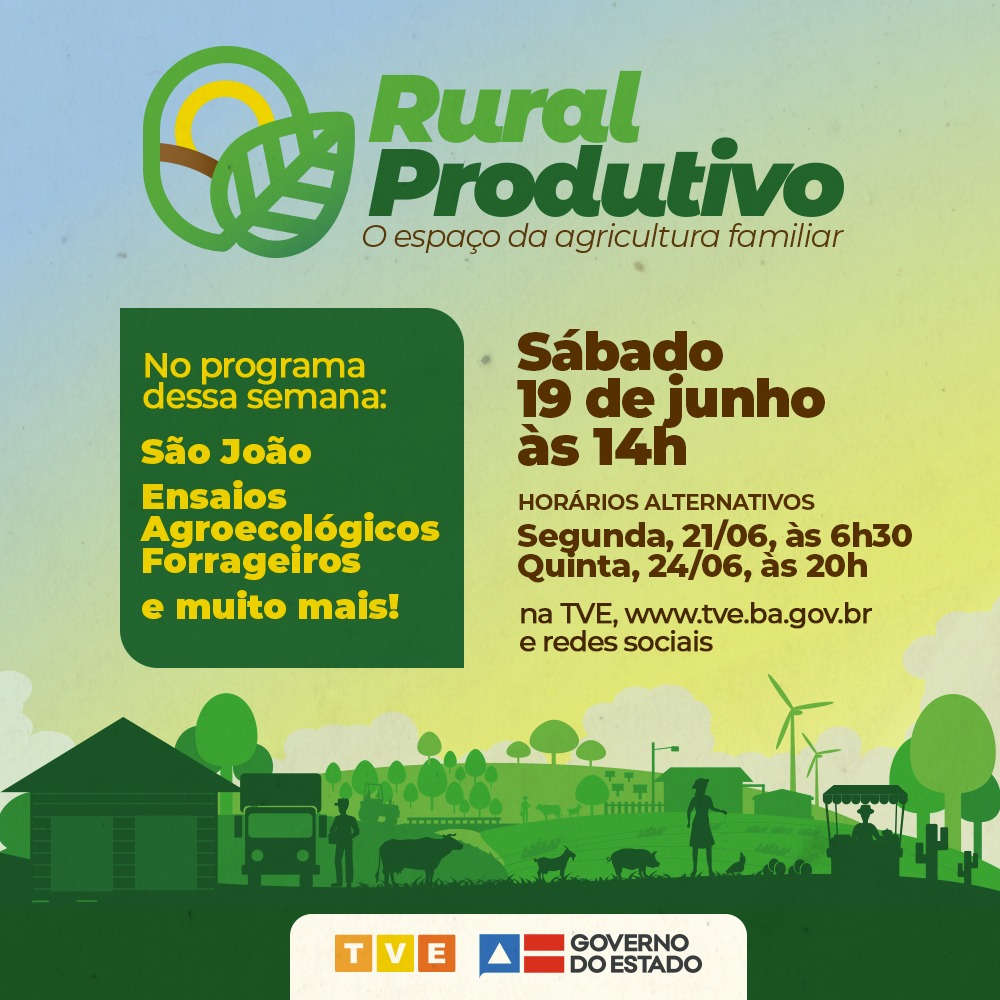 Neste sábado (19), o Rural Produtivo destaca o São João, uma das maiores festas do Estado que, pelo segundo ano consecutivo, é cancelada em função da pandemia. O programa apresenta também o Ensaio Agroecológico Forrageiro, em Itiúba e Campo Formoso. Ainda no clima junino, a atração semanal traz a receita típica de bolo de milho e muita música com a quadrilha Arrasta Pé de Capim Grosso. Sempre aos sábados às 14h, o programa tem horário alternativo nas segundas-feiras, às 6h30, e nas quintas-feiras, às 20h, na TVE.