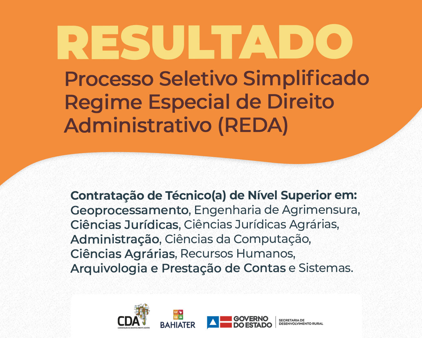 A Secretaria de Desenvolvimento Rural (SDR), divulgou, nesta quinta-feira (08), o resultado provisório da avaliação curricular do Processo Seletivo Simplificado Nº 001/202, por meio do Regime Especial de Direito Administrativo (REDA), para preenchimento de vagas na Coordenação de Desenvolvimento Agrário (CDA) e na Superintendência Baiana de Assistência Técnica e Extensão Rural (Bahiater).