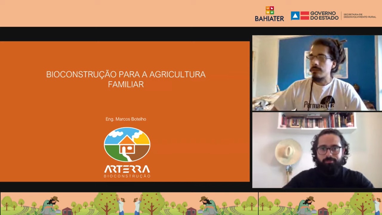 Agentes de assistência técnica e extensão rural (Ater), agricultores e agricultoras familiares e o público em geral puderam conferir a apresentação sobre Bioconstrução para a Agricultura Familiar, durante o Diálogos de Ater desta quinta-feira (05/08). O encontro, que contou com a participação do engenheiro civil e bioconstrutor, Marcos Botelho, foi transmitido, ao vivo, pelo Canal SDRBahia, da Secretaria de Desenvolvimento Rural (SDR), no Youtube, onde pode ser acessado esse e todos os conteúdos dos outros encontros.
