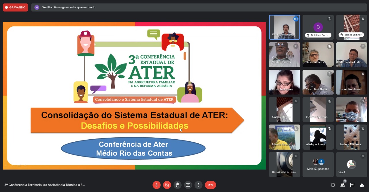 A programação da 3ª Conferência Estadual de Ater na Agricultura Familiar e Reforma Agrária, com o tema Consolidando o Sistema Estadual de Assistência Técnica e Extensão Rural (Ater), segue com as conferências territoriais, no formato virtual. Nesta quinta-feira (19) e sexta-feira (20), foram realizadas as plenárias dos Territórios Médio Rio das Contas, Extremo Sul e Piemonte da Diamantina. Serão realizadas um total de 27 conferências territoriais, no mês de agosto, com transmissão ao vivo pela plataforma Google Meet.