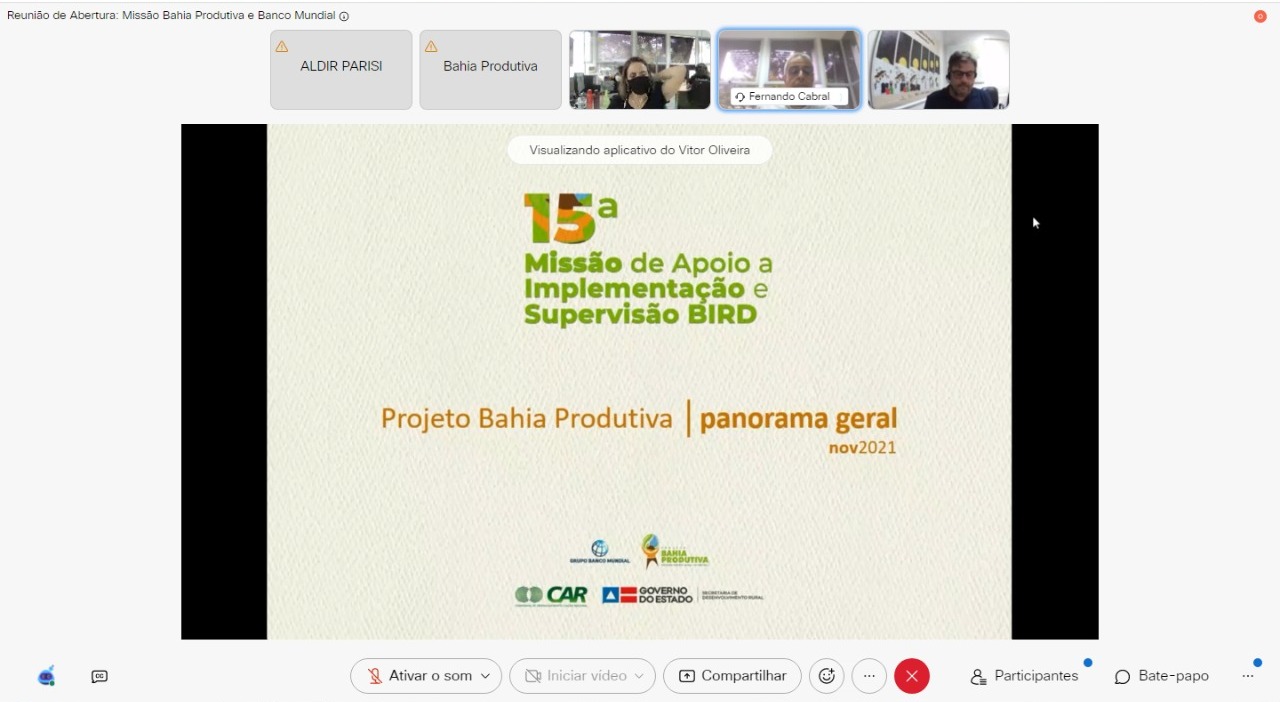 Equipes da Companhia de Desenvolvimento e Ação Regional (CAR), vinculada à Secretaria Estadual de Desenvolvimento Rural (SDR), e do Banco Mundial, participaram, nesta segunda-feira (08), da abertura, em formato virtual, da 15ª Missão de Apoio a Implementação e Supervisão à execução do projeto Bahia Produtiva. A Missão, que acontece até a próxima sexta-feira (12), conta também com a participação de equipes da Secretaria Estadual de Infraestrutura Hídrica e Saneamento (SIHS), Companhia de Engenharia Hídrica e de Saneamento da Bahia (Cerb) e da Embasa.