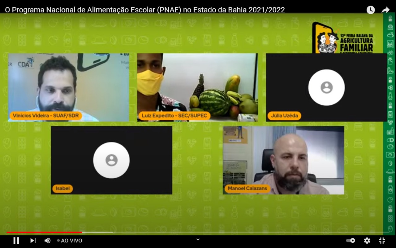 A atividade, que é parte da programação virtual da 12ª Feira Baiana da Agricultura Familiar e Economia Solidária, teve a condução do titular da Superintendência de Agricultura Familiar (SUAF), Vinícios Videira e a participação do Superintendente de Planejamento Operacional da Rede Escolar (Supec/SEC), Manoel Calazans.