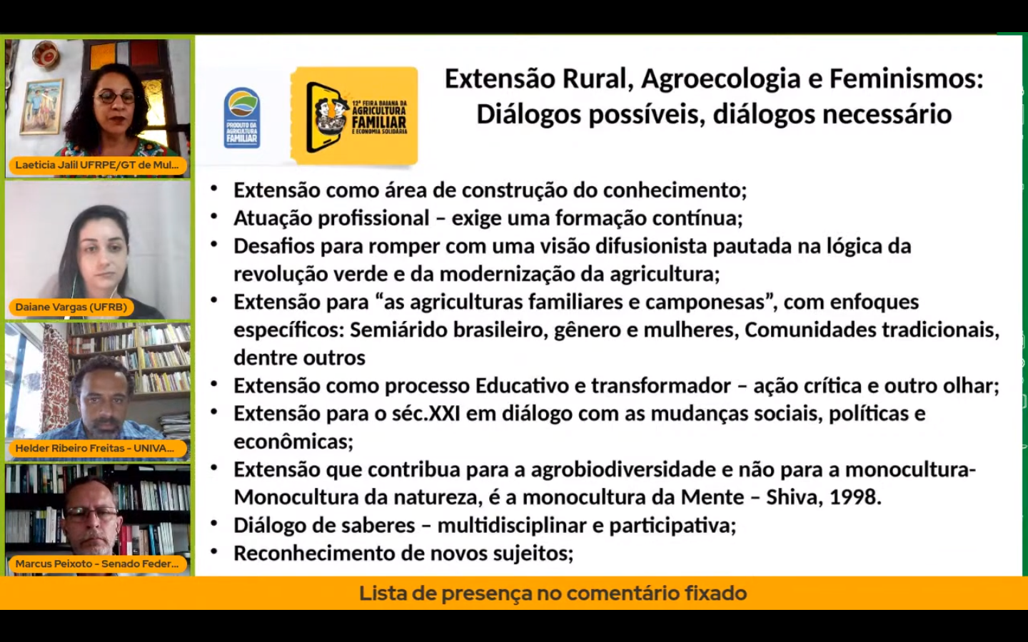 A professora da Universidade do Estado da Bahia (UNEB), Rosana Rodrigues, destacou que a universidade tem uma história de trabalho muito grande no que diz respeito à inserção e diálogo com os Territórios de Identidade da Bahia: “Uma articulação muito próxima dos sujeitos da agricultura familiar camponesa, sobretudo dos movimentos sociais, das organizações não governamentais. Várias instituições que tem como compromisso fazer a formação, a pesquisa e extensão com vistas ao fortalecimento da agricultura familiar. Destaco o papel do Centro Acadêmico de Educação no Campo e Educação Territorial Paulo Freire, que vem desenvolvendo um curso de agroecologia presente, com forte presença da agricultura familiar”.