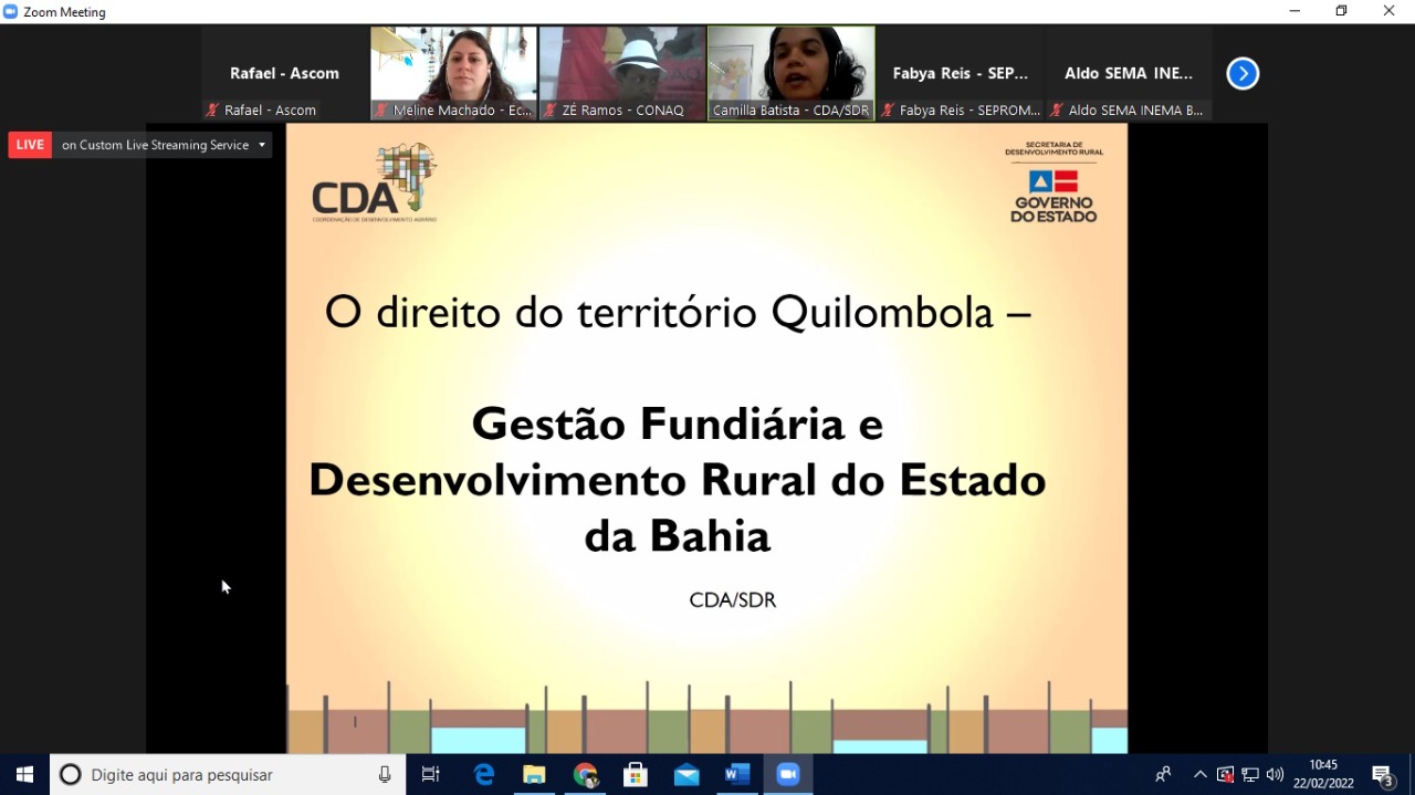 Na oportunidade, a gestora da Coordenação de Desenvolvimento Agrário (CDA/SDR), Camila Batista, tratou de outro ponto essencial para o reconhecimento e fortalecimento das comunidades quilombolas, que é a regularização fundiária.