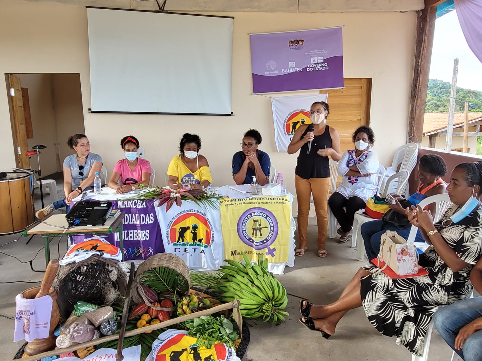 O encontro, que contou com o apoio das prefeituras de Ibirapitanga e de Jussari e foi coordenado pela coordenadora técnica da Bahiater/SDR, Carmem Alves Miranda, teve as participações de equipes técnicas da SDR/Bahiater, do Instituto Federal Baiano (IF Baiano) de Uruçuca e do Conselho Estadual de Segurança Alimentar. Estiveram presentes Luana Pimentel Ribeiro e Marcele Chamusca, coordenadoras técnicas da Secretaria Estadual de Meio Ambiente (SEMA) e Carolina Nunes, assessora técnica da Secretaria de Políticas para Mulheres (SPM). Participam ainda do evento estudantes das escolas do Assentamento, que realizaram uma apresentação sobre a temática: Agroecologia no Assentamento Dois Riachões.