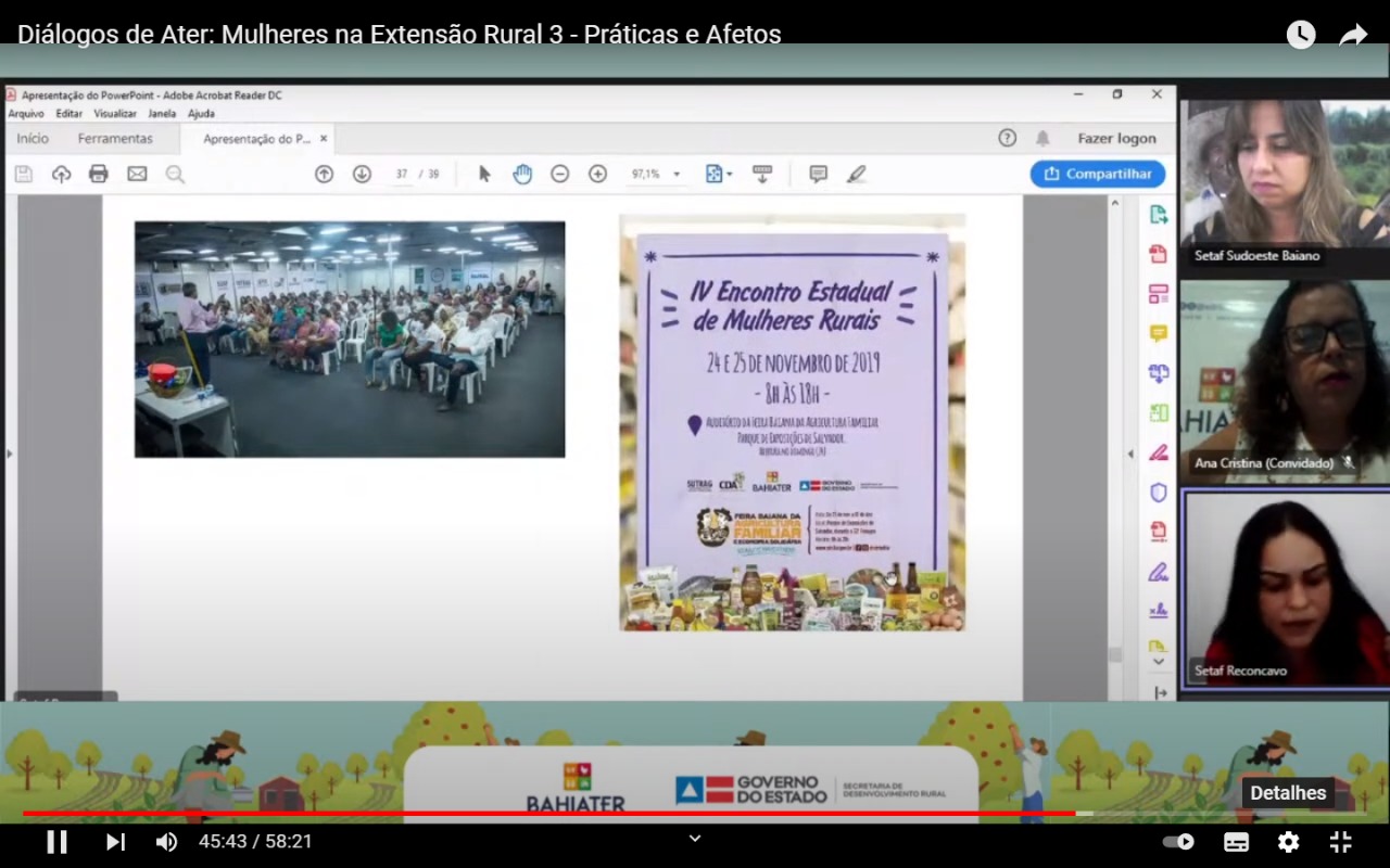 O profissionalismo e o empenho de mulheres na prestação do serviço de assistência técnica e extensão rural (Ater) na Bahia, foram apresentados na edição do Diálogos de Ater, desta quinta-feira (28), que teve transmissão ao vivo no canal da Secretaria de Desenvolvimento Rural (SDRBahia), no Youtube, com o tema: Mulheres na Extensão Rural III – Práticas e Afetos.